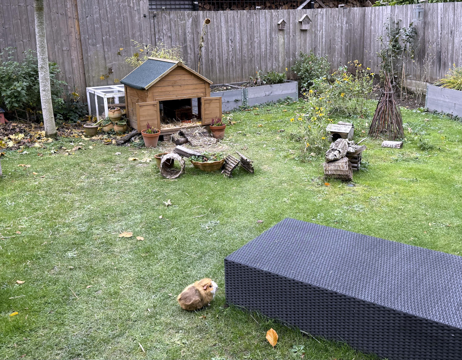 Am Abend fing ich das Schwein mit einem billigen Trick, damit der Fuchs es nicht tat. Am Abend des zweiten Tages – es hatte wieder den ganzen Tag in den Blumen gesessen, psychisch instabil – das Gleiche. Diesmal setzte ich allerdings den Dicken dazu: Sein stationärer Aufenthalt war beendet. Das Pionierschwein kuschelte sich an ihn, gemeinsam verschwanden sie in einem Häuschen, der Rest ist privat. Seither verhält sich es sich wieder normal. Meine Güte!