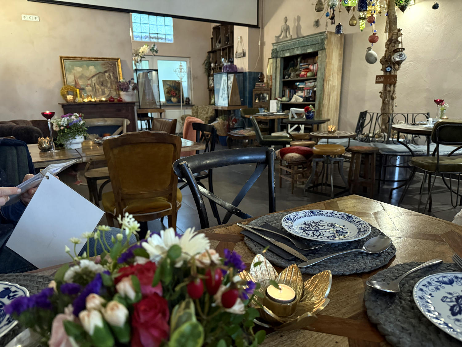 Wir fuhren hinab zur Hochalm. Dort kein Schnee und Eis. Beschwingten Schrittes liefen wir den halbstündigen Weg zur Kreuzeckalm, genossen den Fernblick, und fuhren wieder ins Tal. In der Stadt hatte ich tags zuvor einen Tisch in einem trutschig-hübschen Café reserviert. Dort trafen wir eine Bloggerin nebst Gatten, aßen Kuchen und Strudel, tranken Kaffee und Kakao und unterhielten uns gut.