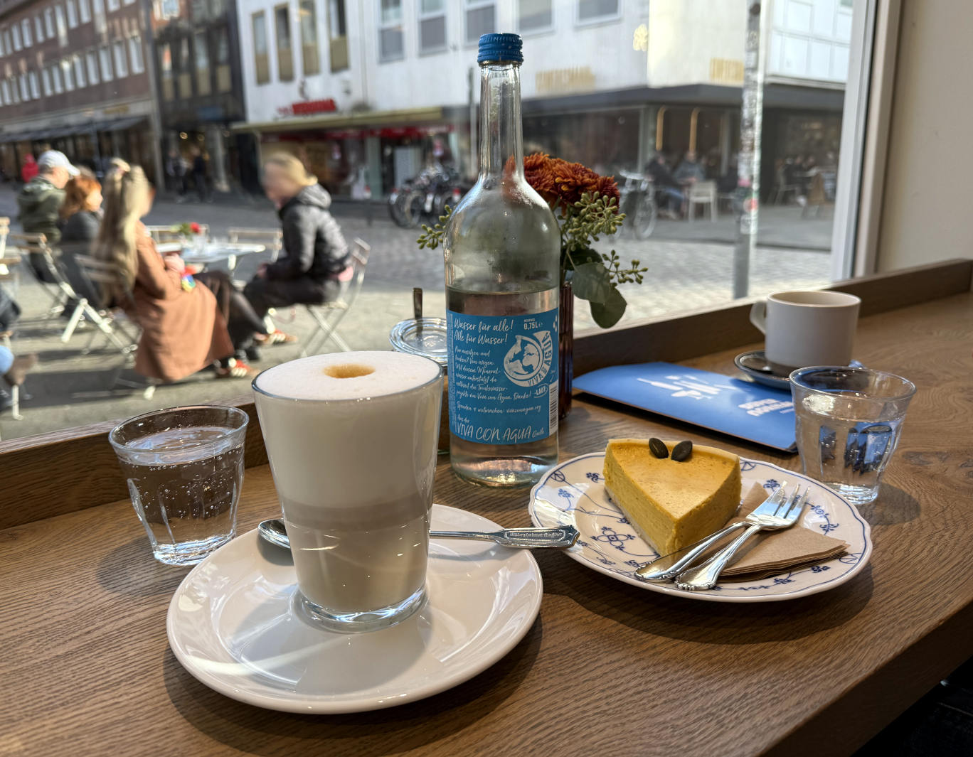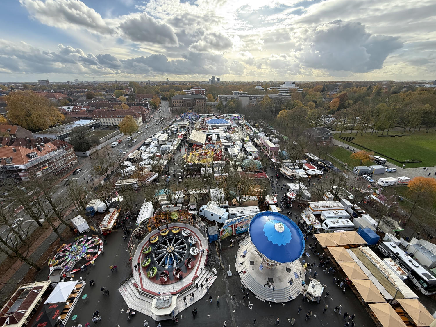 Auf dem Weg zum Kino entdeckten wir, dass Send ist, Kirmes. Am nächsten Tag fuhren wir nochmal nach Münster. Wir wollten zwei Dinge tun: Riesenrad fahren und einen guten Barrista-Kaffee trinken. Im Riesenrad war es super, und der Kaffee war nicht nur gut, er war sensationell, ebenso der Kuchen, ein Kürbis-Cheese-Cake.