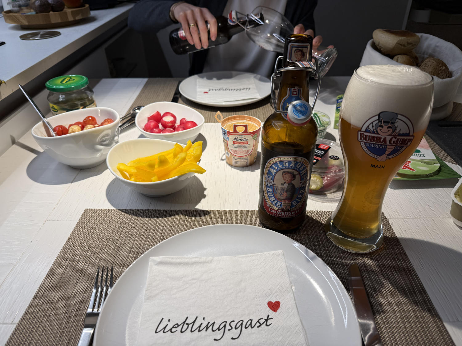 Klappstullenabend | Das Ausblenden der Weltlage scheint mir aktuell hilfreich, ich verschiebe den Fokus ins Private. Der Plan, mich mit den Dortmunder Handballveteraninnen zu treffen, schlug allerdings fehl: Eine war malade, die zweite ist verzogen, der dritten fiel spontan ein, dass sie zum Karnevalfeiern eingeladen war. Blieb die Vierte. Wir sagten den reservierten Tisch beim Japaner ab, verabreten uns in ihrem Wohnzimmer und dinnierten Klappstulle mit Radieschen. Sehr fein.