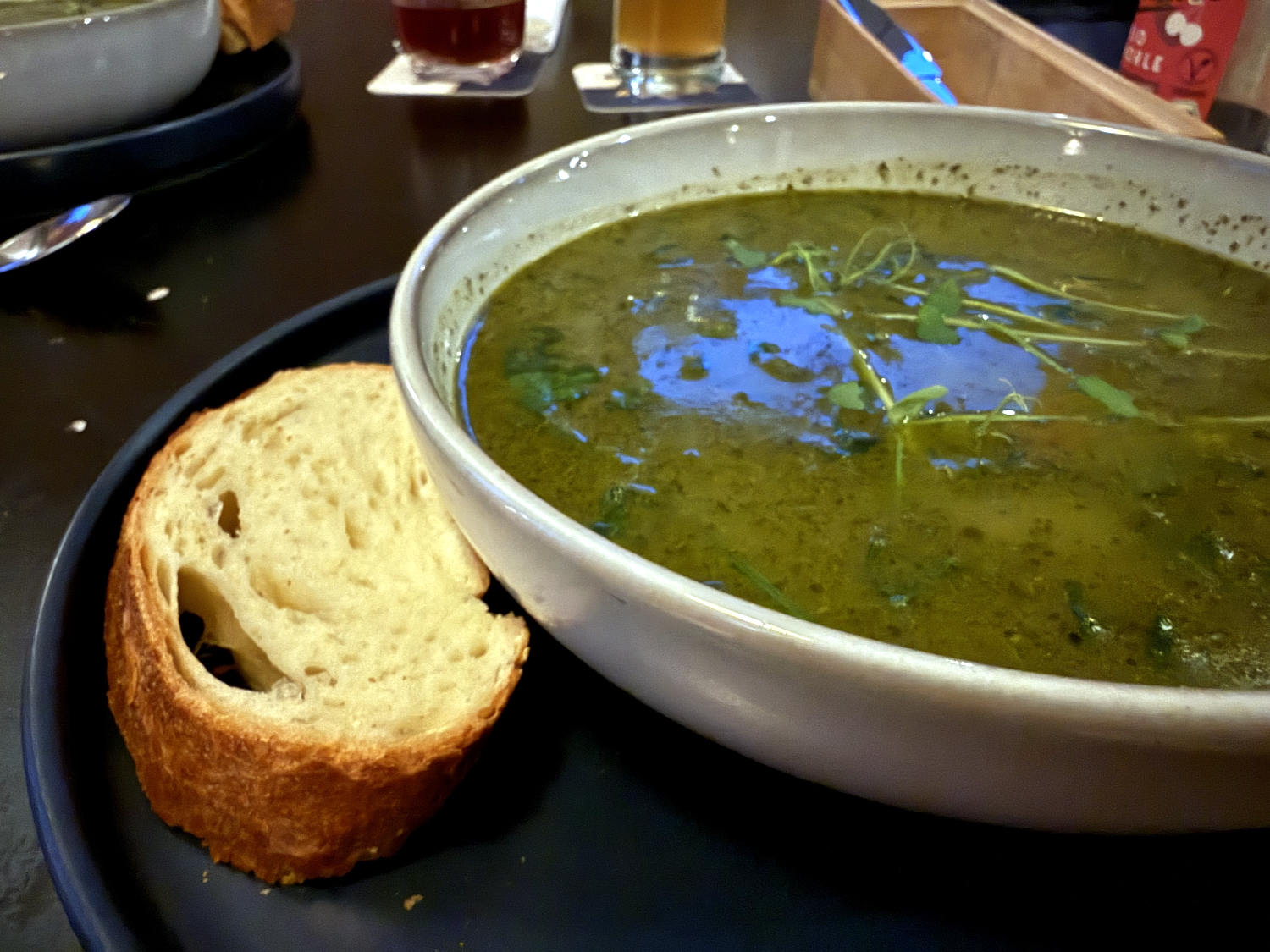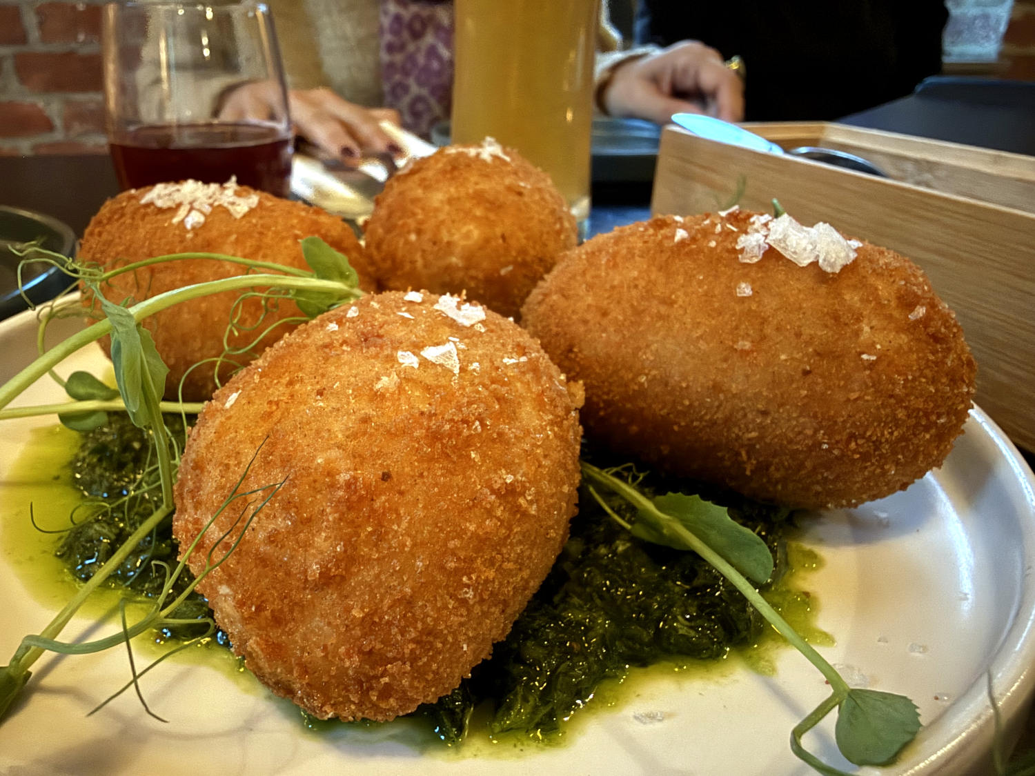 Wir trafen uns diesmal im Nansen, einer Lerngastronomie am Dortmunder Hafen, ein wunderbares Ambiente. Ich entdeckte es, als ich auf dem Jolante-Konzert war, das direkt nebenan stattfand. Es gab frittierte Reis-Eier und grünen Schlotz mit Graupen. Auf der Karte hießen die Gerichte „Arancini mit Gremolata“ und „Persischer Kräutereintopf“. Beides war lecker und mal etwas anderes. Das gefiel mir.