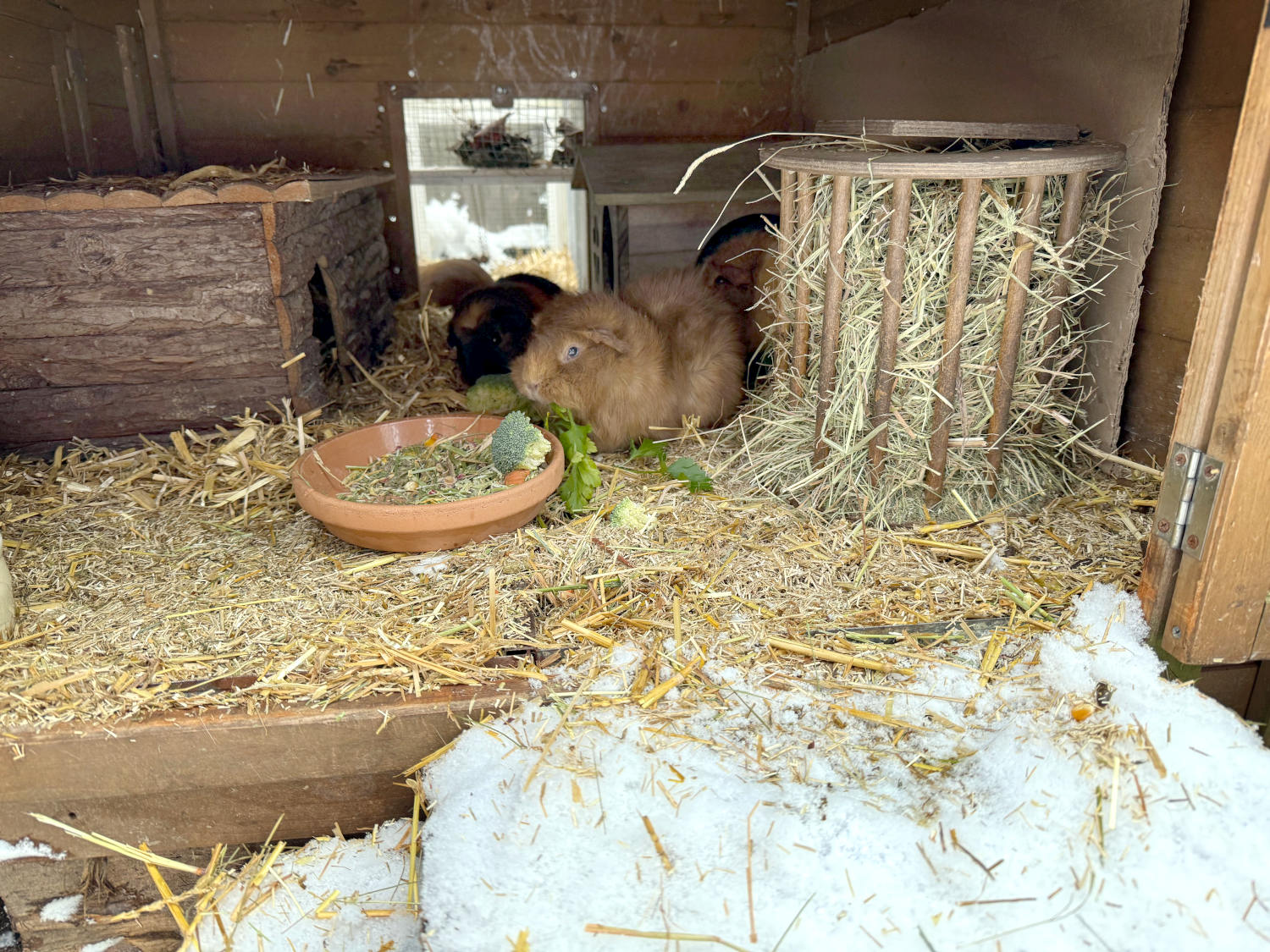 Schweine | Die Schweine leben gut isoliert, auf extra dick Streu und mit viel Stroheinlage. Sie bekommen mehrmals täglich kleine Portionen Gemüse, die sie wegfressen, bevor sie gefrieren. Es bleibt festzustellen, dass die Schweine ein anderes Kälteempfinden haben als wir.