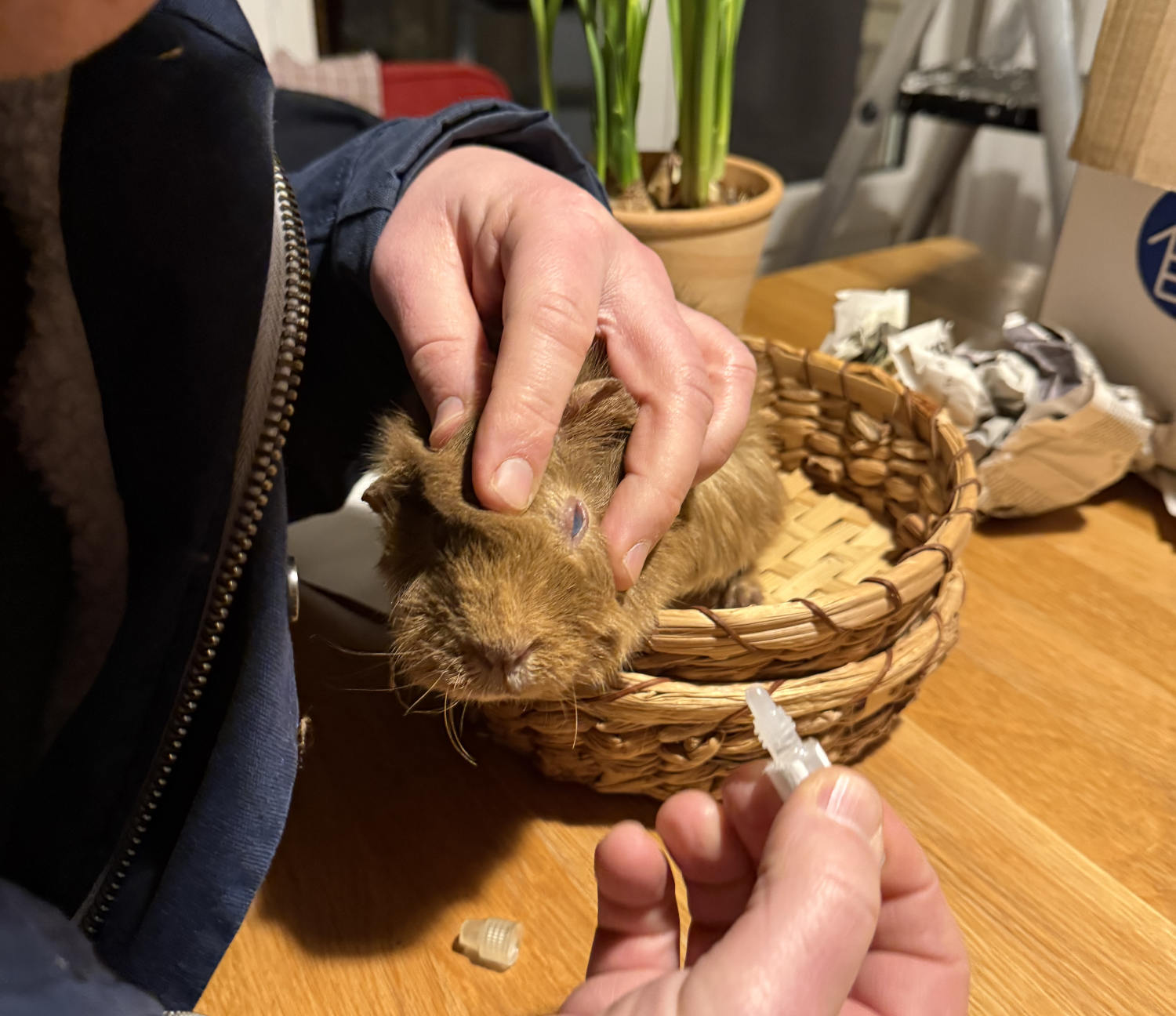 Schweine | Der Dicke ist wieder in Behandlung. Er hat sich am Auge verletzt, die Hornhaut löst sich ab. Entweder hat er sich einen Strohhalm ins Auge gerammt oder ist irgendwo gegen gelaufen, der kleine Trottel. Die Tierärztin verordnete alle zwei Stunden Augentropfen. Wir haben das Wochenende also damit verbracht, das Schwein zu träufeln.