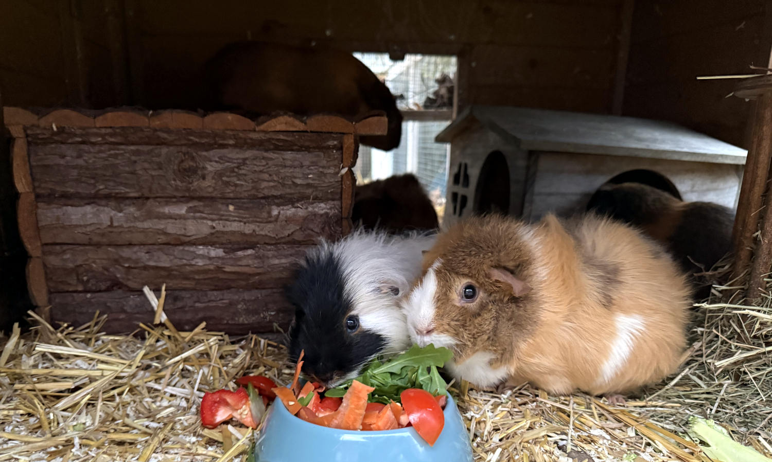 Schweine | Die Damen haben sich miteinander arrangiert. Die schwarz-weiße Oma führt die Gang der Jungschweine an, das Pionierschwein bekuschelt den Dicken. Mit dieser Aufgabenteilung kann man auch gemeinsam essen.