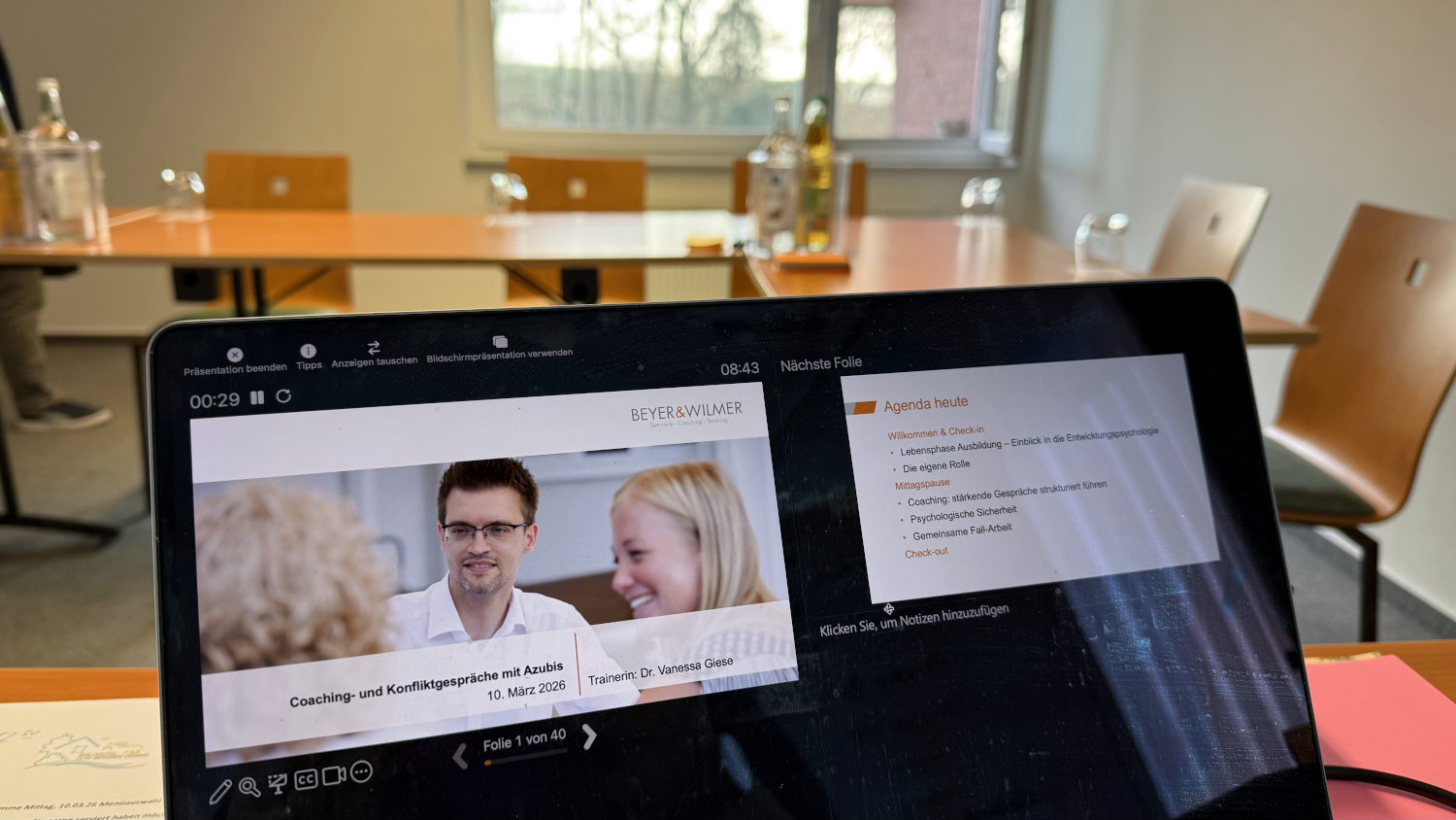 Schwenk von Bochum nach Niedersachsen. In einem Maschinenbau-Unternehmen habe ich zwei Tage lang mit Ausbildungskoordinatoren gearbeitet. Wir haben besprochen, wie sie die Azubis – speziell die IT-Azubis – noch besser unterstützen können. Ich habe die Lebensphase eingeordnet, in der Azubis stecken (die Teilnehmer erkannten ihre eigene Biographie gut wieder), wir haben Coachinggespräche geprobt, und ich habe zwei Schemata mitgebracht, um klare und dennoch respektvolle Konfliktgespräche zu führen. Dazwischen haben wir uns mit den Azubis ausgetauscht – denn es macht Sinn, nicht nur über-, sondern auch miteinander zu reden.