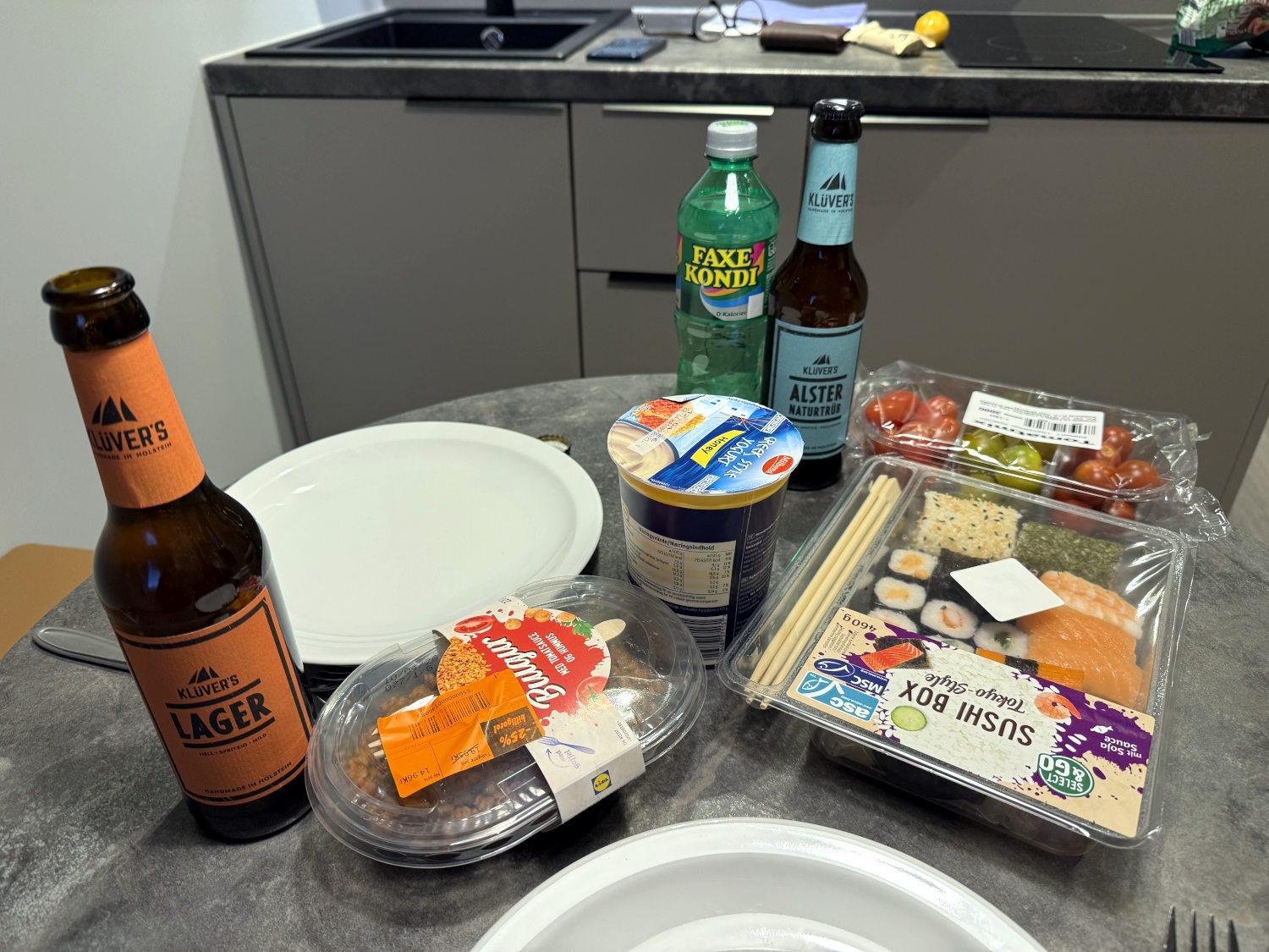 Unsere Unterkunft: Hages Badehotel in Rødby, einen Katzensprung vom Hafen entfernt. Zum Abendessen gab es Spezialitäten aus der Convenience-Theke des örtlichen Discounters.