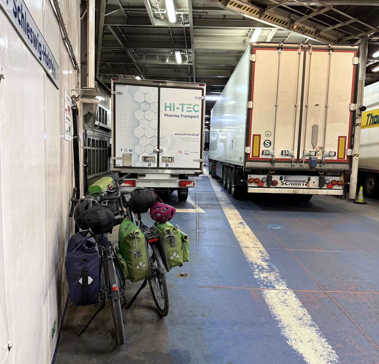 Als die Fähre anlegte, durften wir als erstes los. Wir fuhren zu einem Glashäuschen. Darin: ein Mann, der die Lkws aufs untere Deck einwies. Wir warteten und sahen den Lkws beim Auffahren auf die Fähre zu. Als das untere Deck voll war, durften wir auch rauf. Wir stellten die Räder hinter den Lastwagen ab.
