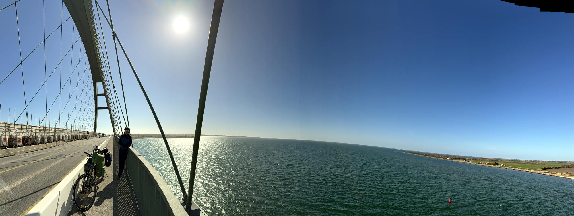 Am nächsten Tag führte uns eine Brücke von der Insel Falster hinunter, die nicht zu übersehen war, auch nicht bei Müdigkeit: die neue Storstrømsbroen, offiziell auch Dronning Margrethe II’s Bro. Sie ist frisch eröffnet, aber noch nicht eingeweiht; das passiert im Juni. Der Bahnverkehr nutzt noch die alte Brücke.