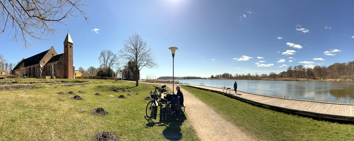 Panoramaaufnahme: Links eine Kirche, in der Mitte ein Mann an einem Tisch, neben zwei Fahrräder, rechts zieht sich ein See mit einem Steg ins Bild.