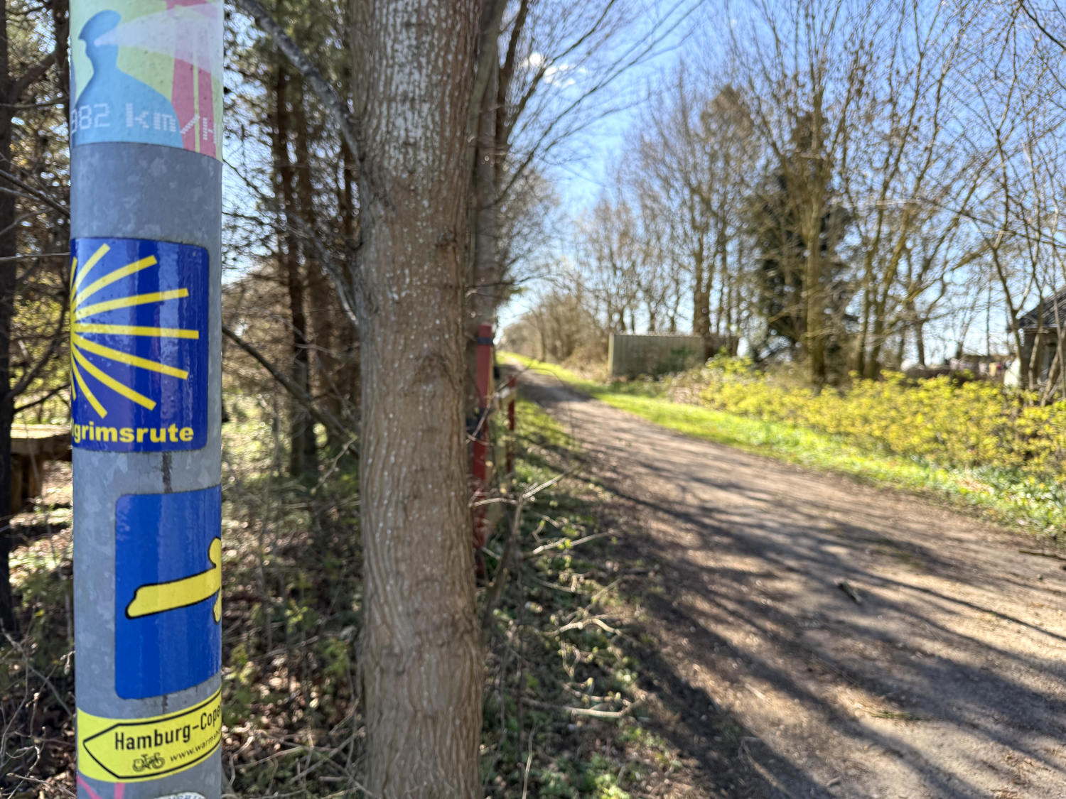 Laternenpfahl mit Aufklebern: Pilgrumsroute, Radsymbol und Schrift "Hamburg - Copenhagen"