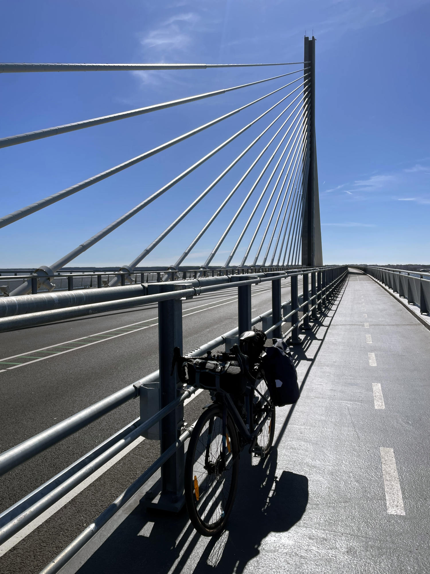 Fußgänger und Fahrradfahrer sind auf dieser Brücke nicht wirklich vorgesehen. Hinter einer niedrigen Betonwand gibt es zwar einen kombinierten Rad- und Fußweg. Aber weder können sich zwei Fahrräder begegnen, noch ein Fahrradfahrer und ein Fußgänger. Vorbeifahrende LKWs sind eine Armlänge entfernt – ein intensives Erlebnis.