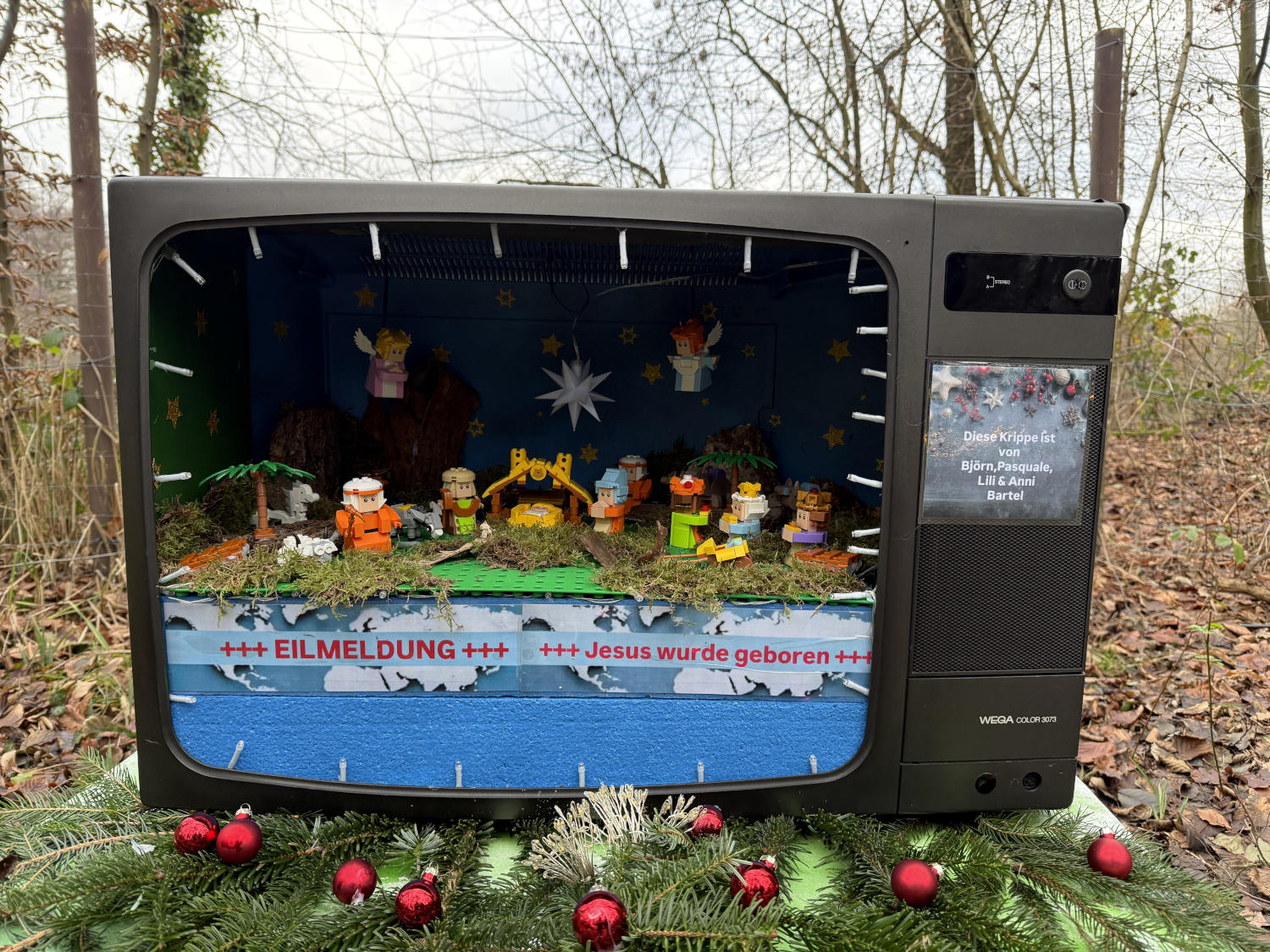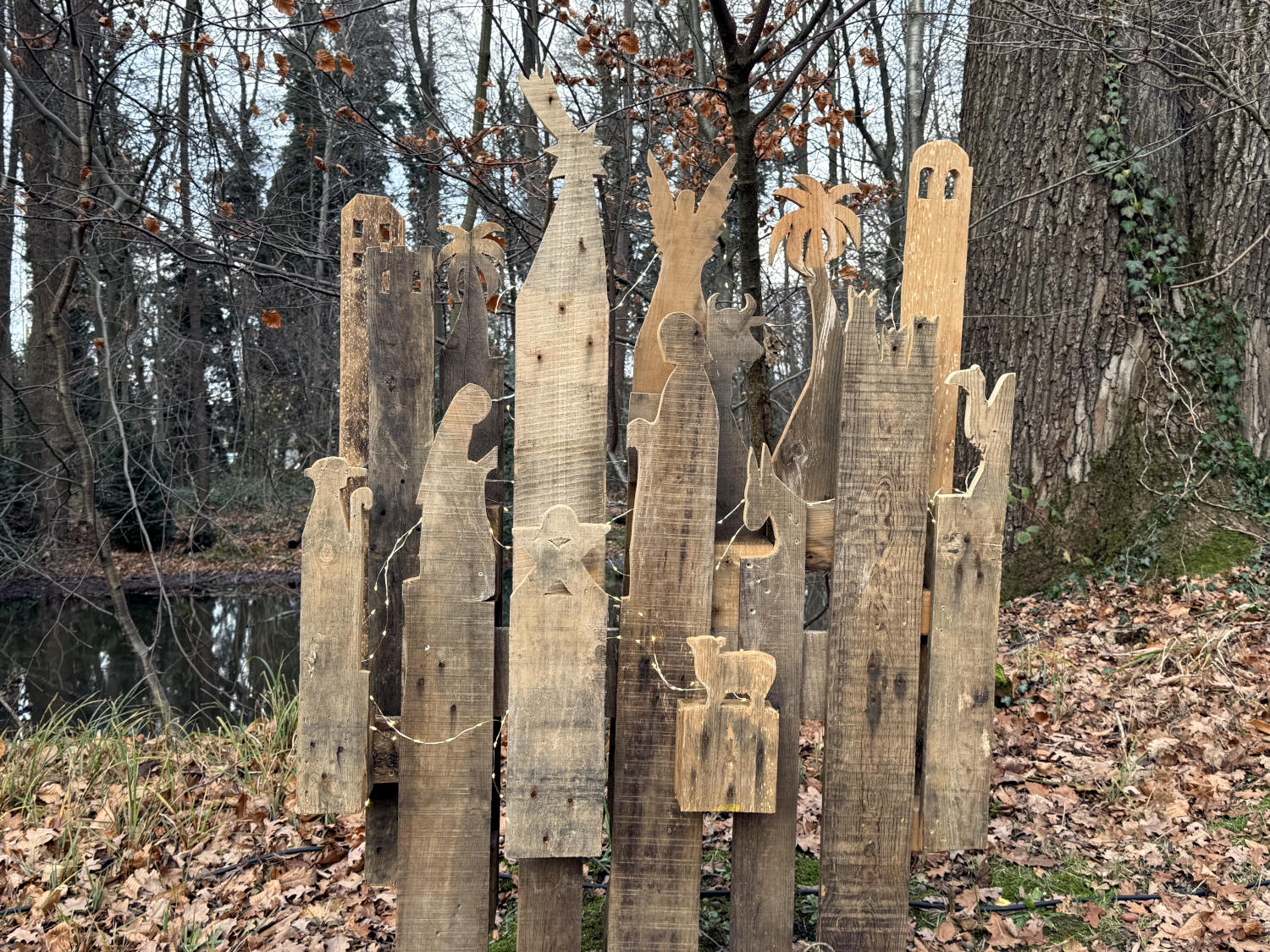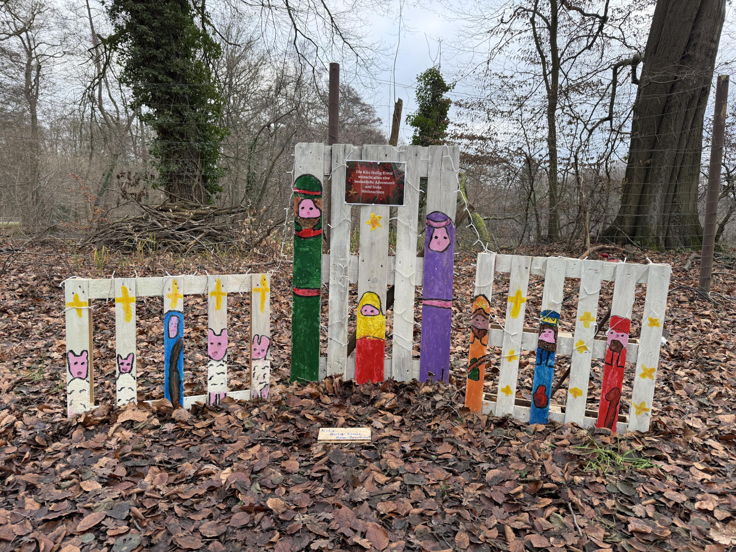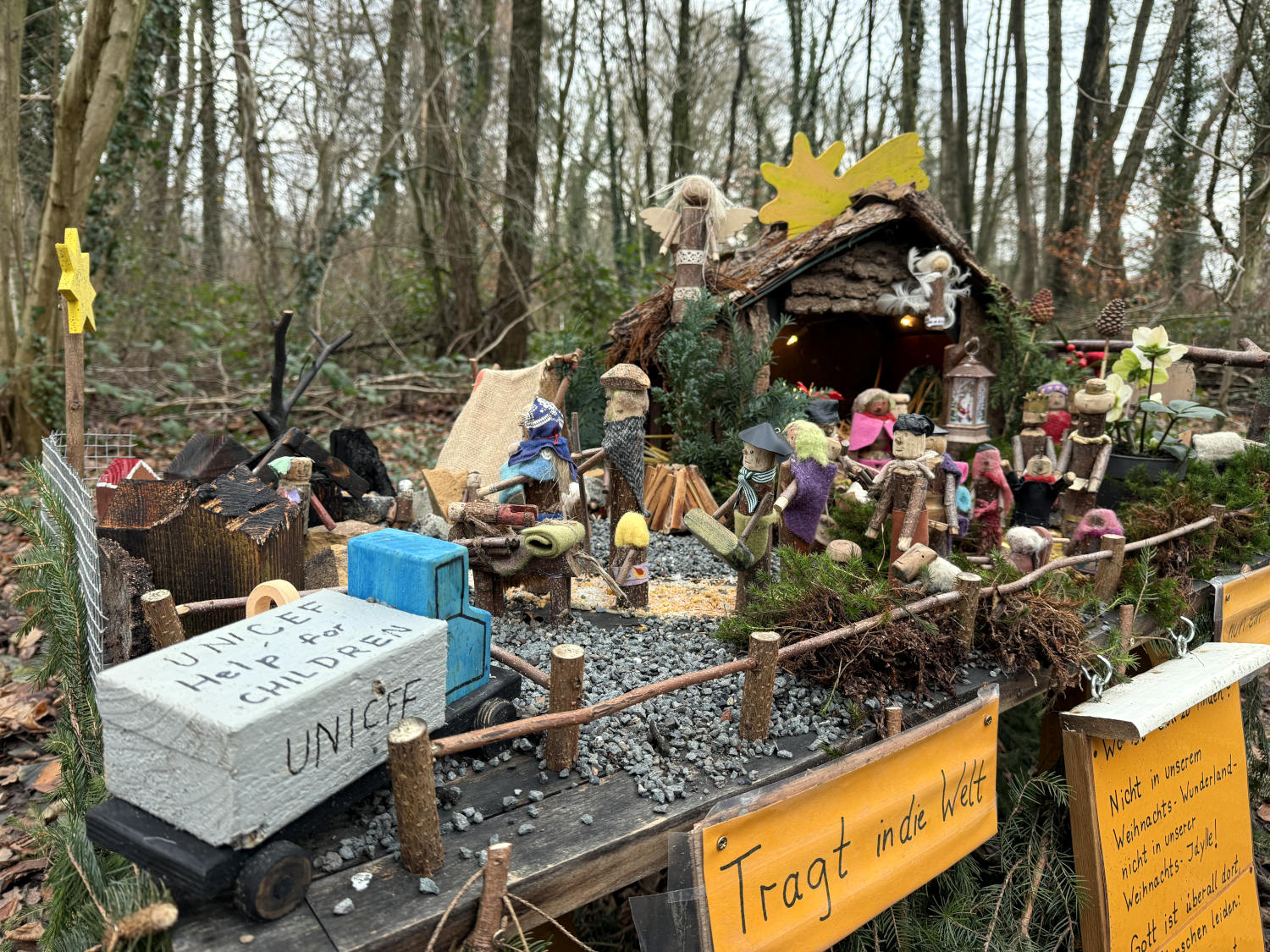 Krippenweg | Ich komme von einer kleinen Rundfahrt, Fahrradfahren kann man ja zu jeder Jahreszeit. Wir fuhren zum Hof Hagedorn, ein Hof mit Café und Bäckerei, Gemüsescheune, Schinkentenne und Pralinentheke. Wir kauften Kuchen, ich erwarb kleinere Weihnachtsgeschenke. Außerdem hielten wir am Schloss Sythen an. Dort gibt es alle zwei Jahre einen Krippenweg. Nachbarn, Kinder und Freunde basteln Krippen aus Stoff, Holz, Draht, Beton, Salzteig und Lego, der künstlerische Spielraum ist groß.