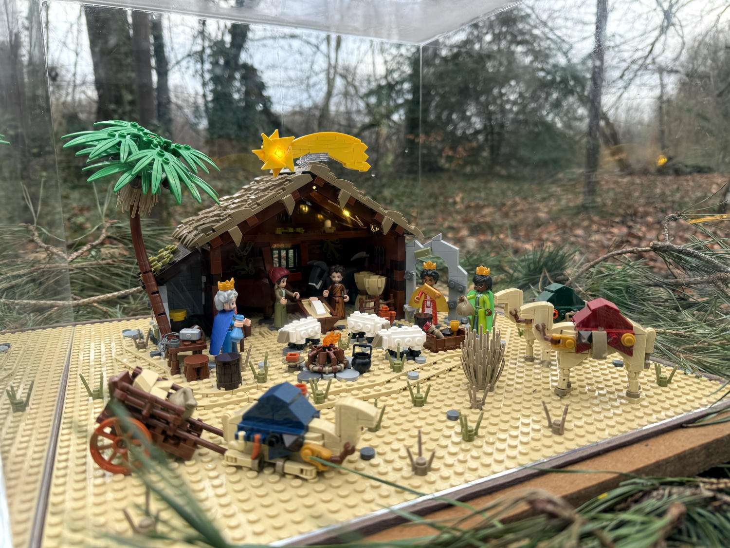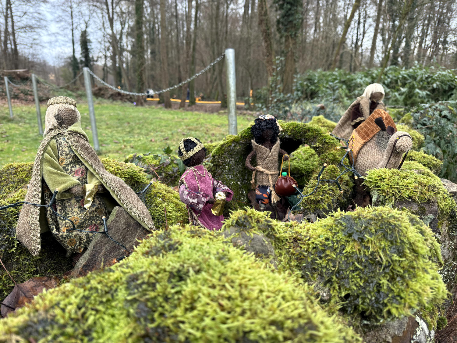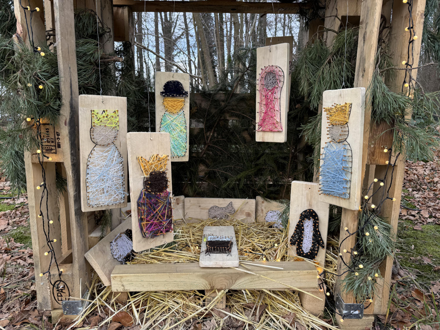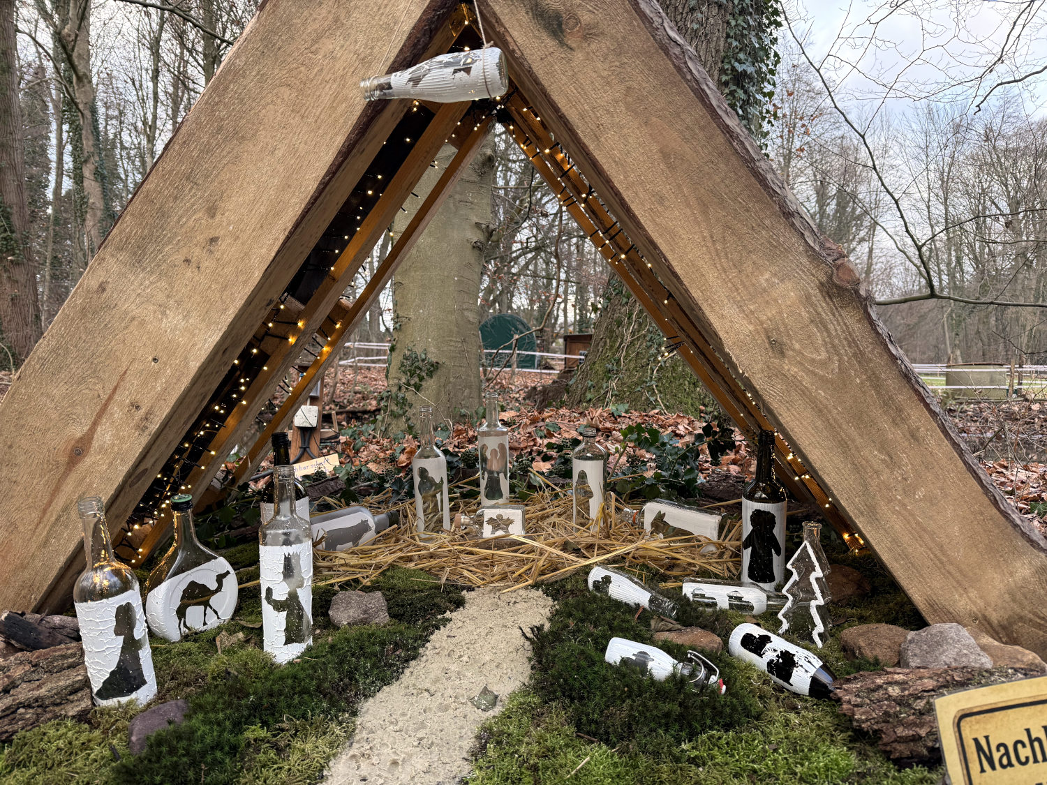 Krippenweg | Ich komme von einer kleinen Rundfahrt, Fahrradfahren kann man ja zu jeder Jahreszeit. Wir fuhren zum Hof Hagedorn, ein Hof mit Café und Bäckerei, Gemüsescheune, Schinkentenne und Pralinentheke. Wir kauften Kuchen, ich erwarb kleinere Weihnachtsgeschenke. Außerdem hielten wir am Schloss Sythen an. Dort gibt es alle zwei Jahre einen Krippenweg. Nachbarn, Kinder und Freunde basteln Krippen aus Stoff, Holz, Draht, Beton, Salzteig und Lego, der künstlerische Spielraum ist groß.